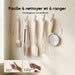 Chaque outil dispose d'une boucle de suspension pour un séchage rapide et un rangement ordonné. La pince alimentaire est dotée d'un anneau de verrouillage réglable pour la maintenir fermée lorsqu'elle n'est pas utilisée, économisant ainsi de l'espace supplémentaire.