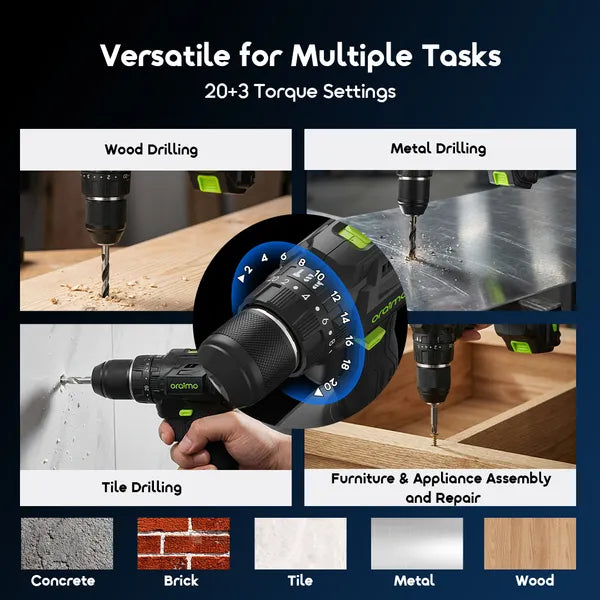 Featuring 20 precise torque levels and 3 working modes, MaxDrill handles everything from delicate assembly to heavy‑duty work, making it suitable for concrete, masonry, tile, metal, and wood—safe on both materials and fasteners.