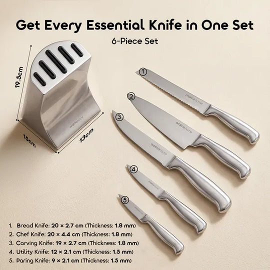 Prix régulier CFA30,000Product Parameters: Model: OHKK-001Material: SS 3Cr13 (Knife Blades)+ SS 430 (Knife Block)Product Size:Knife Block: 10*10*16.8cmChef Knife: L 20cm*T 1.2mmBread Knife: L 20cm*T 1.5mmCarving Knife: L 19cm*T 1.5mmUtility Knife: L 12cm*T 1.2mmParing Knife: L 9cm*T 1.2mm *oraimo... -