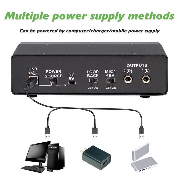 Sélection de puissance flexible La carte son a le port USB prend en charge la connexion avec des appareils PC ou iOS qui peuvent directement enregistrer et également être alimentés. Vous pouvez également choisir un adaptateur d'alimentation USB standard 5V 2A ou une banque d'alimentation USB externe (non incluse dans la boîte) pour assurer la stabilité de l'alimentation. Les méthodes d'alimentation diversifiées vous permettent d'utiliser la carte son n'importe quand et n'importe où.