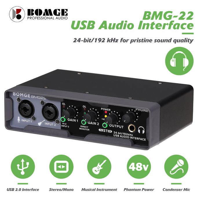 Brancher et utiliser L'interface audio BMG22 est facile à utiliser, elle peut parfaitement correspondre à Pro Tools/Ableton Live Lite/Reaper/Ableton et à d'autres logiciels d'enregistrement DAW. Le logiciel DAW n'est pas inclus, ce qui signifie que vous avez plus de flexibilité pour choisir votre production sonore. BMG22 n'a pas besoin de télécharger de pilotes propriétaires, son interface audio USB est un pilote générique pour Windows ou Mac. pilotes, son interface audio USB est un pilote générique pour Windows ou Mac.