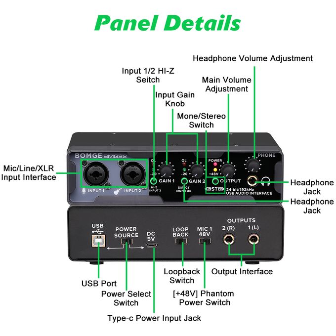 L'interface audio BMG22 a des entrées combo 1 et 2 avec contrôle de gain, vous pouvez connecter n'importe quelle combinaison de microphones ou d'instruments aux entrées combo BMG22 et profiter de l'excellente qualité sonore professionnelle. Les préamplis micro de classe A feront briller vos instruments vocaux et acoustiques. L'entrée 1 a un interrupteur d'alimentation fantôme + 48 V pour le microphone à condensateur. Vous devez utiliser la prise XLR pour activer l'alimentation fantôme 48 V sur INPUT 1 (entrée micro).