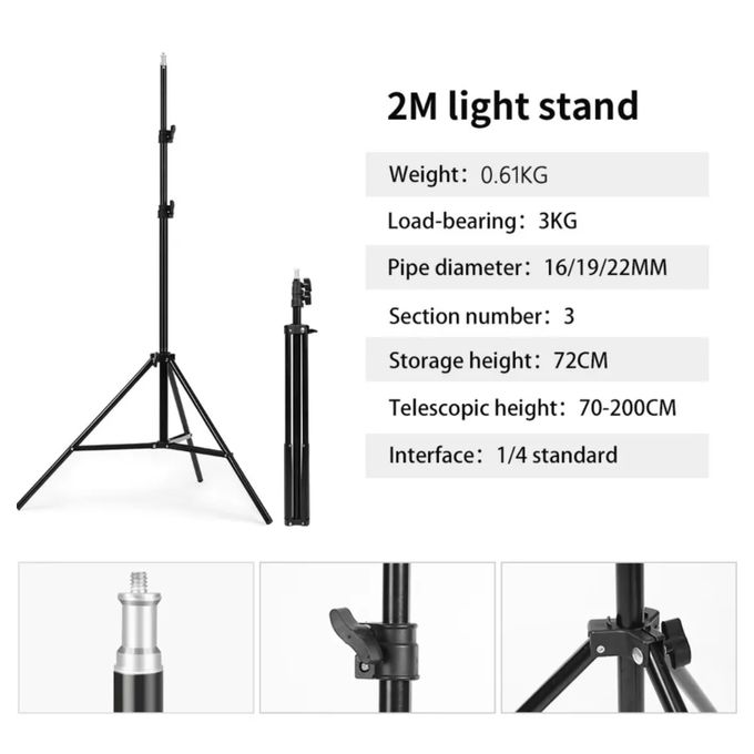 Poids (g): 610Longueur étendue 2 Matériel: métal Taper: TRÉPIED PROFESSIONNEL, Trépied Flexible Utiliser: Appareil Photo Numérique, Caméra Vidéo, Téléphone Mobile, Lumière Capacité de chargement: 2KGSections de jambes : 3Nom du produit : Support de lumière de photographie 2MLéger Portable Extensible a 2metre Style: Trépied 7 pieds Fonction: trépied de téléphone éclairé Compatible: Boîte à lumière, lumière de photographie, lumière annulaire, appareil photo, téléphone Convient à: Appareil photo reflex numérique Usage: Prise de vue en studio Application: Photo Studio Photographie Lumière Couleur: Noir
